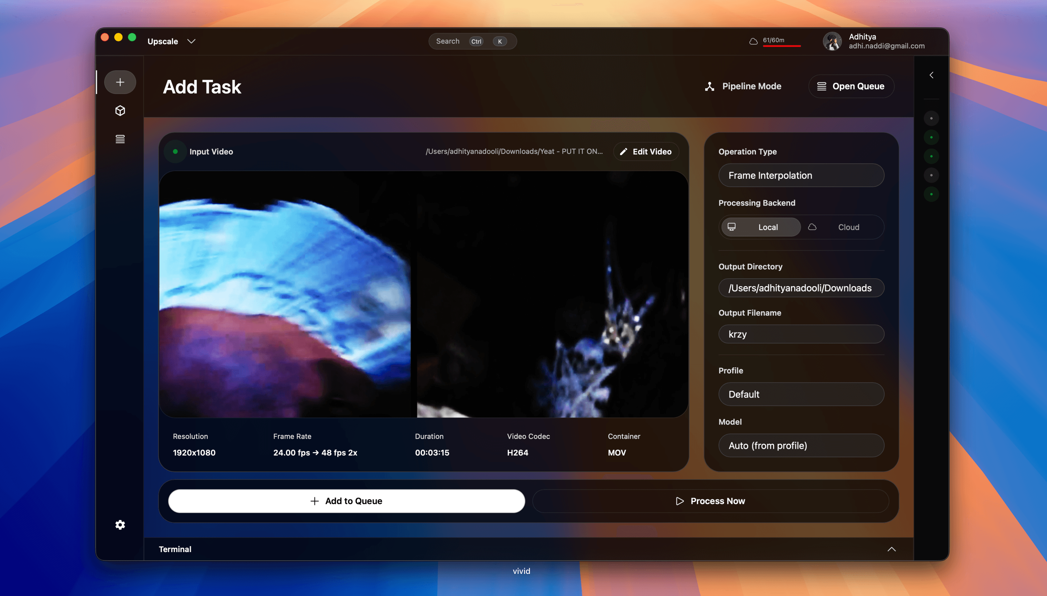 Vivid offers cloud and local processing, batch queue system, live preview, chaining of interpolation/upscaling/restoration, video trimming, custom ESRGAN models, scene detection, color themes, Discord Rich Presence, and a realtime player.